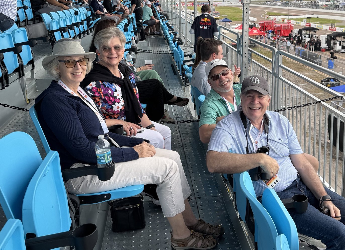 It is time to start what has become our annual Florida trip. Sometime after a leisurely drive through Atlanta, we end up in St.Pete, ready to start the Indycar season. We meet up with the Coopers and the Beckers Thursday evening. The weekend consists of 3 days of practice, qualifying and racing mixed among 3 or 4 different levels of cars, so there is something going on constantly. Most of us head to the track to christen the Cooper Suite the next morning. Karen and Jane decided on a bit of non-racing site-seeing. The next couple of days were special. Jane & I had the pleasure of sharing Scott’s hospitality with some of my high school friends. Saturday it was Bruce Bohanon and his wife Mary, and Sunday Bryan and Maggie Davidson. Both days were full of exciting racing, interspersed with short periods of relative quiet when we could actually carry on a conversation. I think both couples enjoyed themselves and had a chance to experience something new and loud. It was nice to spend some time with good friends.